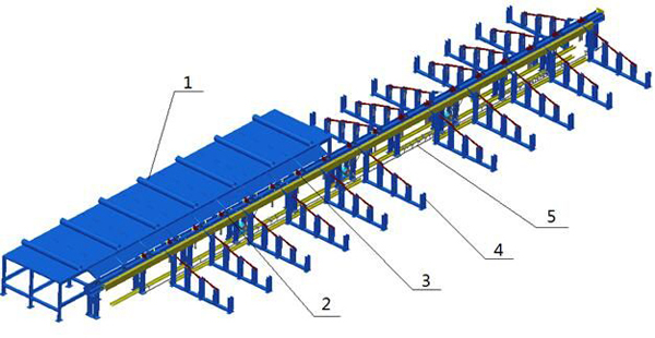 钢筋不定尺分拣线主要由待拣料平台(1)、输送轨道(2)、扫描系统(3)、储料槽(4)、气动系统(5)、电控系统组成,设备结构如图2-1所示。